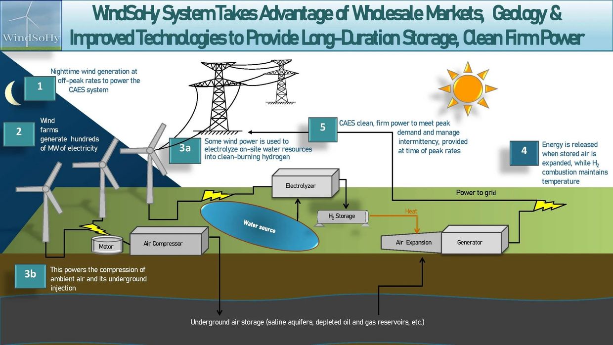 Combining proven technologies such as Compressed Air Energy Storage (CAES) with wind power and renewable hydrogen, WindSoHy will become the nation's first producer of completely clean, renewable, baseload electrical power from wind.